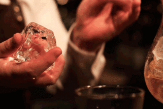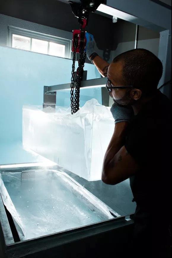俗話說,冰凍三尺,非一日之寒。手鑿的冰塊取材自巨型冰板(block of ice),而制作它需要使用特殊的冰板制作儀(block ice machine)。冰板的制作通常要三至四天,在緩慢的冰凍過程中儀器需不斷攪拌,使水中的氣泡消失,直至冰塊完全純凈透明。沒有任何氣泡摻雜的冰塊有著更高的密度,稀釋速率也就隨之降低。